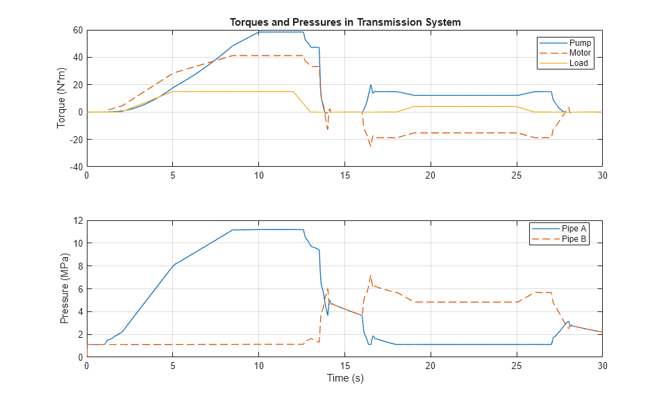 次のプロットは、モーターで生成されるトルクと、ポンプおよび機械的負荷を駆動するトルクを示しています。また、ポンプが逆になったときに変速機の 2 つのパイプ内の圧力が高圧と低圧の間で切り替わる様子も示されています。