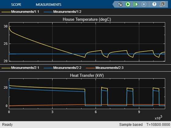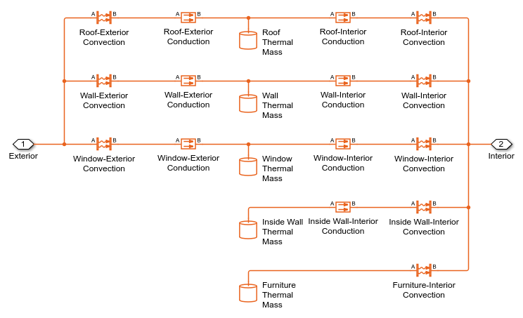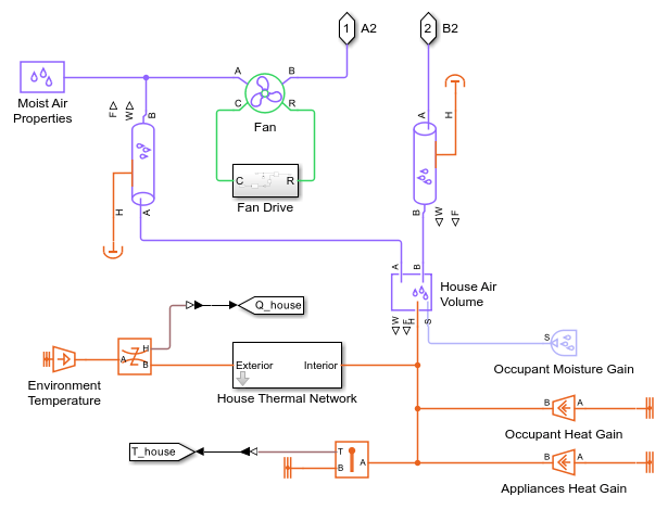 このモデルの冷却負荷は住宅であり、湿り空気ドメインの空気の体積として表されます。高温の外部環境と住宅の空気の間での壁、屋根、窓を介した熱伝達が熱ネットワークでモデル化されます。さらに、住宅の中の人や電化製品によって熱が発生します。冷却のために、ファンによって住宅と蒸発器の間で空気が循環されます。温度を 22℃に保つために、システムのオンとオフを切り替えるサーモスタットによってシステムが制御されます。