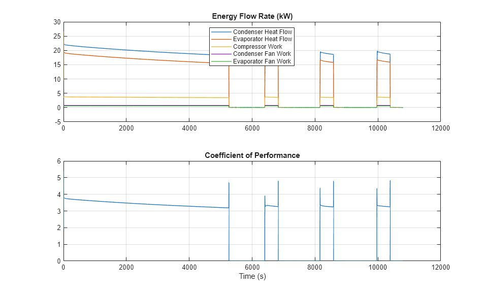 次のプロットは、凝縮器および蒸発器における熱伝達とコンプレッサーおよびファンによる消費電力を示しています。パフォーマンス係数は、総消費電力に対する蒸発器の熱伝達の比です。