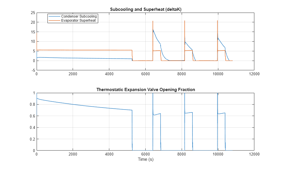 次のプロットは、凝縮器出口の過冷却度と蒸発器出口の過熱度を示しています。過熱度を 5℃に保つために、蒸発器への流量がサーモスタット膨張弁で調整されます。