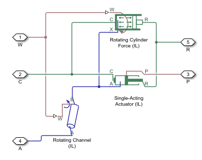 This example uses a Rotating Single-Acting Actuator (IL) block to model a hydraulic cylinder actuator for operating friction clutches, brakes, and other devices installed on rotating shafts. A key element of the actuator is a piston that moves back and forth under an axial force that consists of the static pressure force and a rotating cylinder force developed by centrifugal force on the rotating fluid.