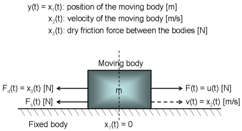 x1(t) = s(t) Position of the moving body [m]. x2(t) = v(t) Velocity of the moving body [m/s]. x3(t) = F_d(t) Dry friction force between the bodies [N].