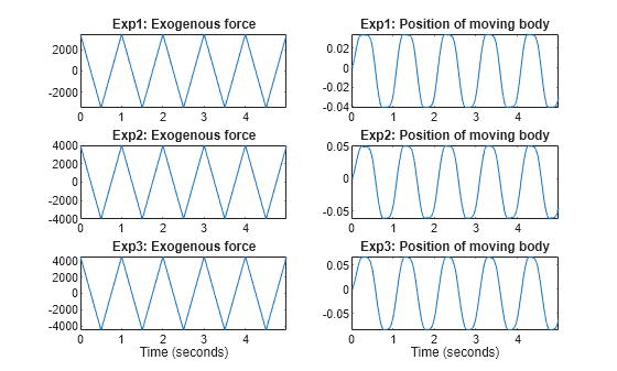 この時点で、使用できる入出力データ (シミュレーションを実行したもの) を読み込みます。ファイルには 3 つの異なる (シミュレーションを実行した) テスト実行から得られたデータが含まれ、それぞれサンプリング レート (Ts) 0.005 秒を使用して生成されたノイズで破損された入出力サンプルが 1000 個含まれています。入力 u(t) は移動する剛体に作用する外力 [N] です。実験では、入力は対称的なのこぎり波状信号で、波形繰り返し周波数はすべての実験について同一ですが、最大信号振幅はテスト実行によって異なります。出力 y(t) は移動する剛体の位置 [m] です (固定された剛体に対して相対的)。このモデル化の目的のため、3 つの異なる実験データをもつ 1 つの IDDATA オブジェクトを作成します。