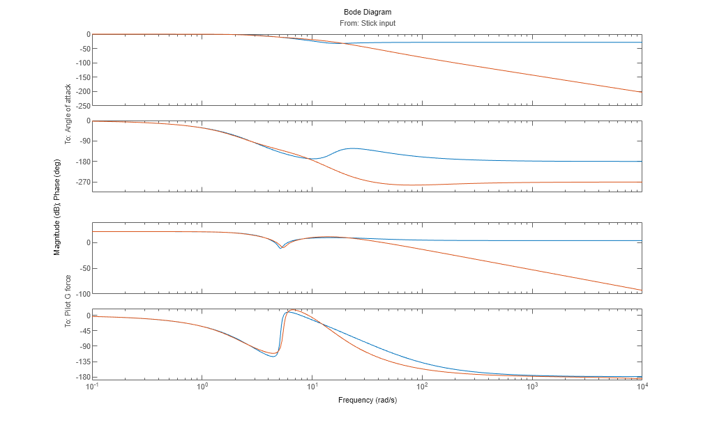 syslin は 2 つの出力、1 つの入力、9 つの状態があるモデルです。これは、"Stick Input" 入力から 2 つの出力への線形化パスに元のシステムの 9 つの状態が含まれているためです。これは operpoint を使用して検証できます。
