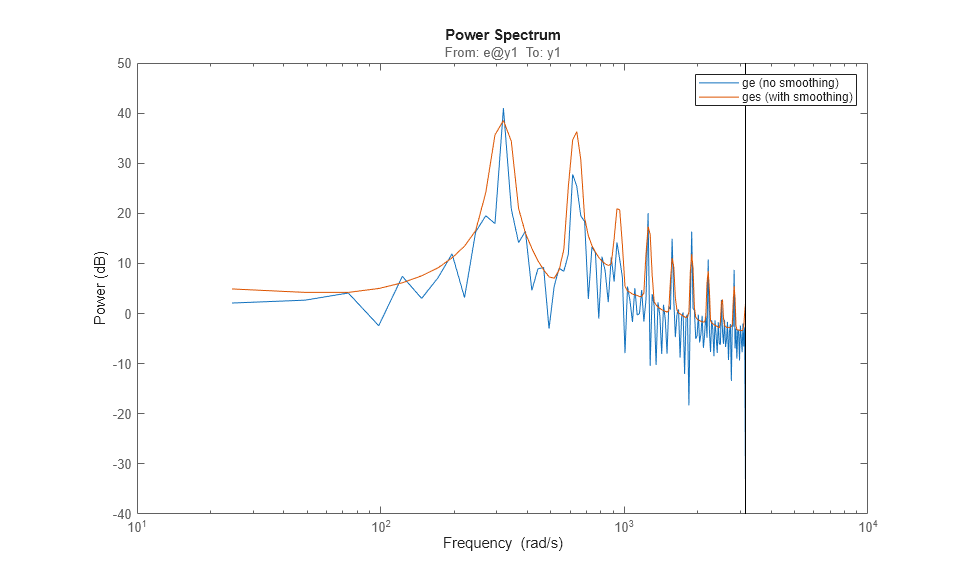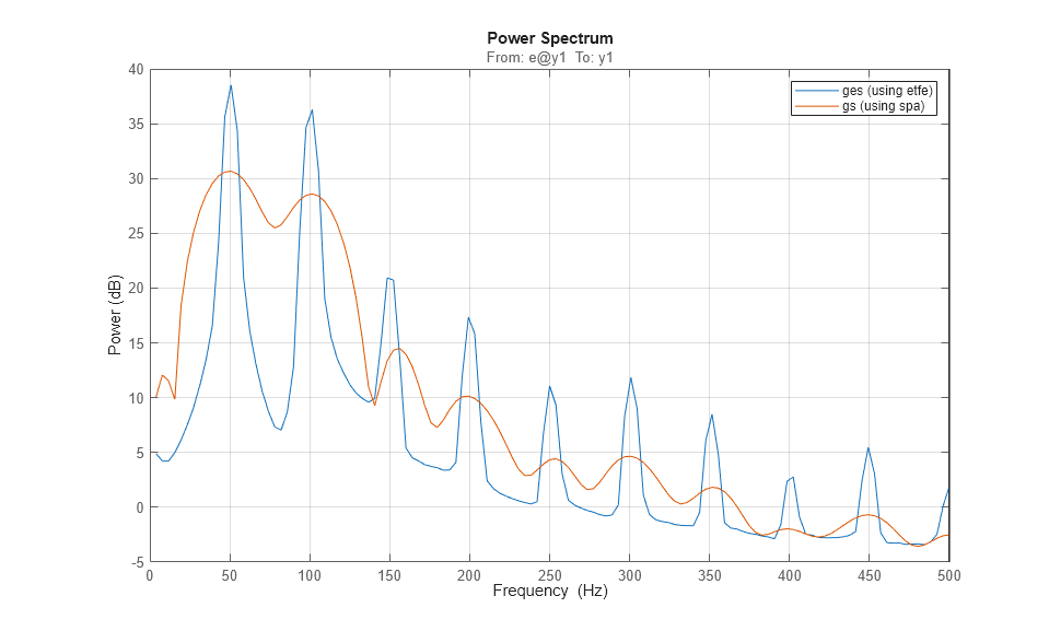 gs = spa(i4r); hold on spectrumplot(gs); legend({'ges (using etfe)','gs (using spa)'}) hold off