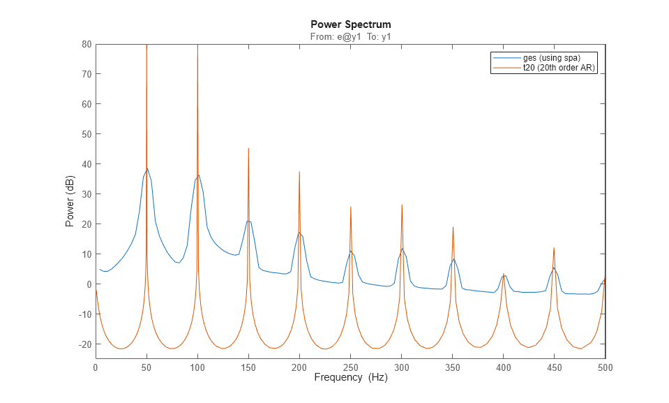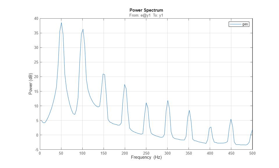 h = spectrumplot(ges); opt = getoptions(h); opt.FreqScale = 'linear'; opt.FreqUnits = 'Hz'; setoptions(h,opt); axis([0 500,-5 40]) grid on, legend('ges')