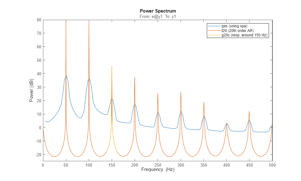 g20c = idfrd(t20,(551:650)/600*150*2*pi); % A frequency region around 150 Hz spectrumplot(ges,t20,g20c,opt) axis([0 500 -25 80]) legend({'ges (using spa)','t20 (20th order AR)','g20c (resp. around 150 Hz)'});