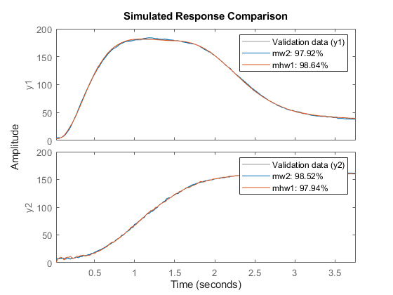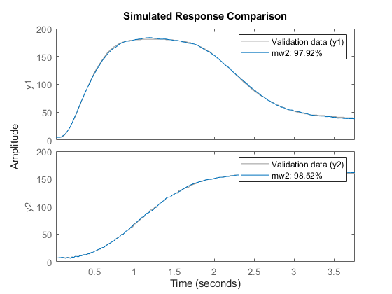 mw2 = <strong>Nonlinear ARX model with 2 outputs and 6 inputs</strong> Inputs: u1, u2, u3, u4, u5, u6 Outputs: y1, y2 Regressors: Linear regressors in variables y1, y2, u1, u2, u3, u4, u5, u6 Output functions: Output 1: Wavelet network with 27 units Output 2: Wavelet network with 25 units Sample time: 0.02 seconds Status: Estimated using NLARX on time domain data "Motorized Camera". Fit to estimation data: [99.22;99.15]% (prediction focus) FPE: 0.1262, MSE: 0.4453