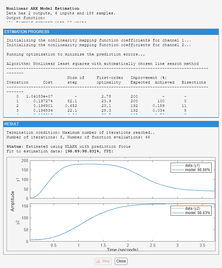 同様に、シグモイド ネットワーク (idSigmoidNetwork オブジェクト) をマッピング関数として使用できます。最大反復 (MaxIterations) や反復表示などの推定オプションは、nlarxOptions コマンドを使用して指定できます。