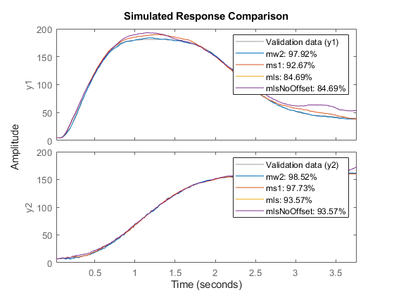 さまざまなモデルを、同じ COMPARE コマンドで比較できます。たとえば、モデル mw2、ms1、mls および mlsNoOffset のシミュレーション出力と、データセット "z" の測定された出力を比較します。