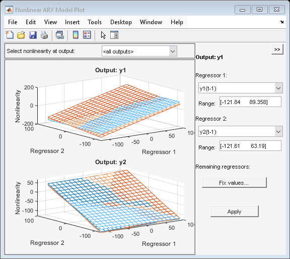 場合によっては、リグレッサーをモデル出力にマッピングする関数を非線形にする必要はありません。この関数は単に、リグレッサー ベクトルの加重合計にオプションのオフセットを加えたものにできます。これは、線形 ARX モデルと類似 (オフセット項を除く) しています。出力チャネルに非線形が存在しないことは、関数 idLinear を選択すると指定できます。以下の例は、model_output(t) = F(y(t-1), u(t-1), u(t-2)) において、関数 F は 1 番目の出力に対して線形成分で、2 番目の出力に対して非線形成分 (idSigmoidNetwork) で構成されることを意味します。