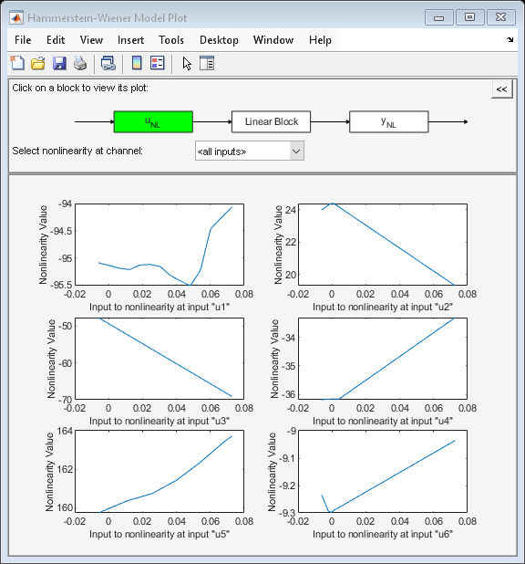 ここで、Orders = [nb bf nk] = [ones(2,6), ones(2,6), ones(2,6)] を選択します。これは、線形ブロックで、各出力が、6 つの出力に基づいた最初の 6 つの次数伝達関数の合計となることを意味します。入力非線形性が区分的線形関数で記述される Hammerstein モデル (出力非線形なし) を使用してみましょう。入力した 1 つの idPiecewiseLinear オブジェクトが、すべての 6 入力チャネルに自動的に展開されます。idUnitGain は非線形が存在しないことを示しています。