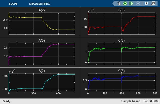 多項式 A(q)、B(q)、C(q) の推定パラメーターは、シミュレーション中に次のように変化します。