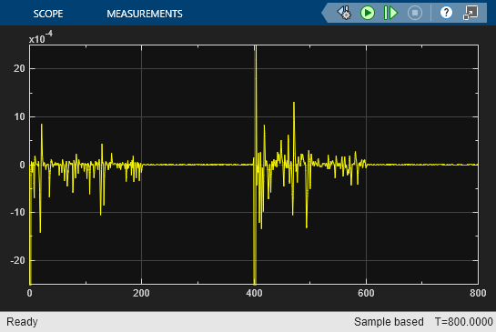 推定モデルのより厳密な検査では、推定モデルのシミュレーションを実行し、実際のモデル出力と比較します。iddemo_cstr/Time-Varying ARMAX ブロックは、Online Polynomial Model Estimator ブロックで推定した時変 ARMAX モデルを実装しています。CSTR システムの出力と推定時変 ARMAX モデルの出力の誤差は次のとおりです。