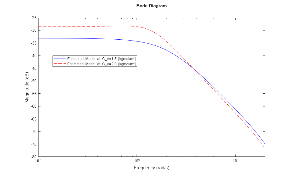 Ts = 0.1; tidx = find(t>=200,1); P200 = idpoly(AHat(:,:,tidx),BHat(:,:,tidx),CHat(:,:,tidx),1,1,[],Ts); tidx = find(t>=600,1); P600 = idpoly(AHat(:,:,tidx),BHat(:,:,tidx),CHat(:,:,tidx),1,1,[],Ts); bodemag(P200,'b',P600,'r--',{10^-1,20}); legend('Estimated Model at C_A=1.5 [kgmol/m^3]', ... 'Estimated Model at C_A=2.0 [kgmol/m^3]', ... 'Location', 'Best');