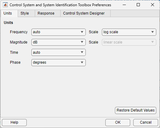 [Control System および System Identification Toolbox の基本設定] ダイアログ ボックスを使用すると、セッション間で維持するプロット基本設定を設定できます。