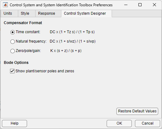 [制御システム デザイナー] タブには、制御システム デザイナー アプリの設定が用意されています (Control System Toolbox™ のライセンスが必要)。