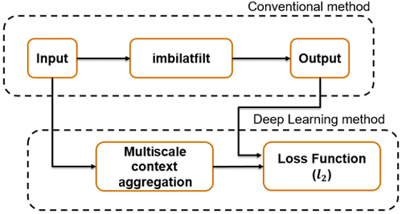 マルチスケール CAN は、イメージ処理演算の従来の出力と、マルチスケール コンテキスト集約を使用して入力イメージを処理した後のネットワーク応答との間の 損失を最小限に抑えるように学習させています。マルチスケール コンテキスト集約は、各ピクセルに関する情報をイメージ全体から検出し、ピクセル周囲の小さな近傍の検索対象に限定しません。
