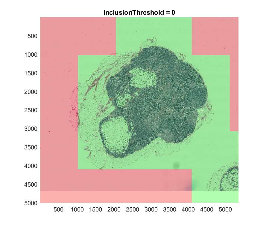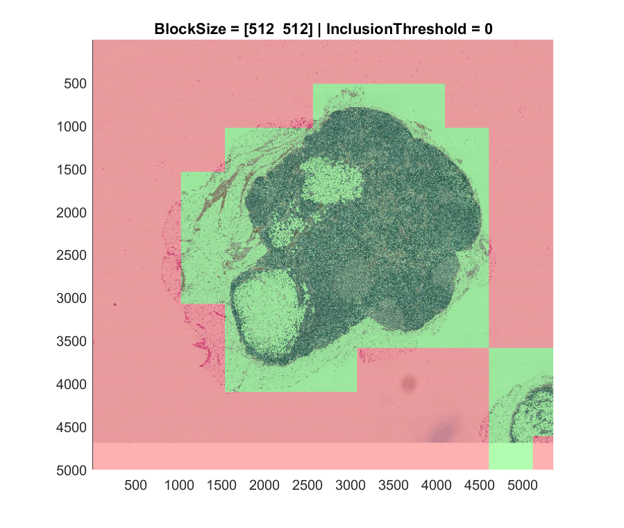 blockSize = [512 512]; h = bigimageshow(bim); showmask(h,bmask,1,BlockSize=blockSize,InclusionThreshold=0) title("BlockSize = [" + num2str(blockSize) + "] | InclusionThreshold = 0")