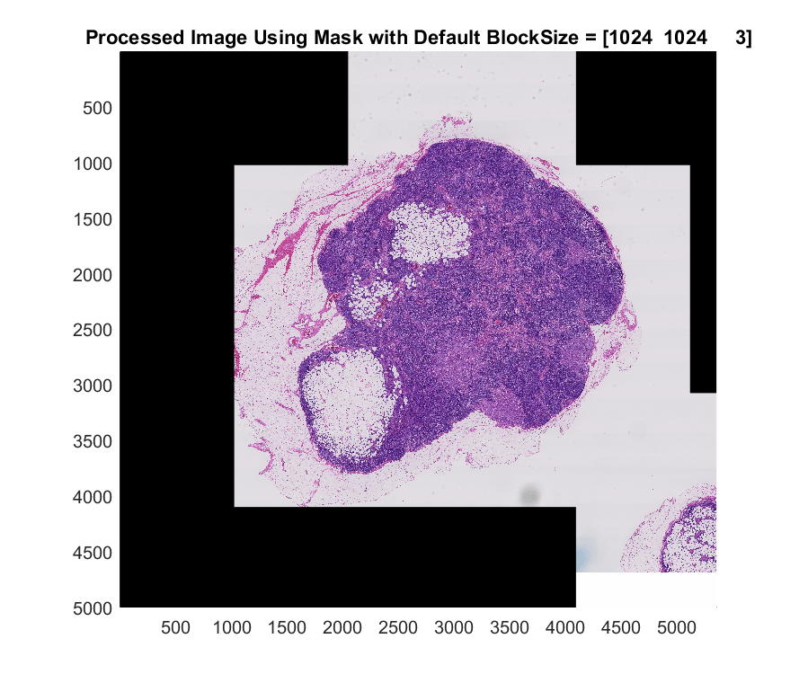 bls = selectBlockLocations(bim,Mask=bmask,InclusionThreshold=0); tic boutMasked = apply(bim, ... @(bs)imnlmfilt(bs.Data,DegreeOfSmoothing=15), ... BlockLocationSet=bls); tMaskedProcessing = toc; bigimageshow(boutMasked) defaultBlockSize = bim.BlockSize(1,:); title("Processed Image Using Mask with Default BlockSize = [" + ... num2str(defaultBlockSize)+"]");
