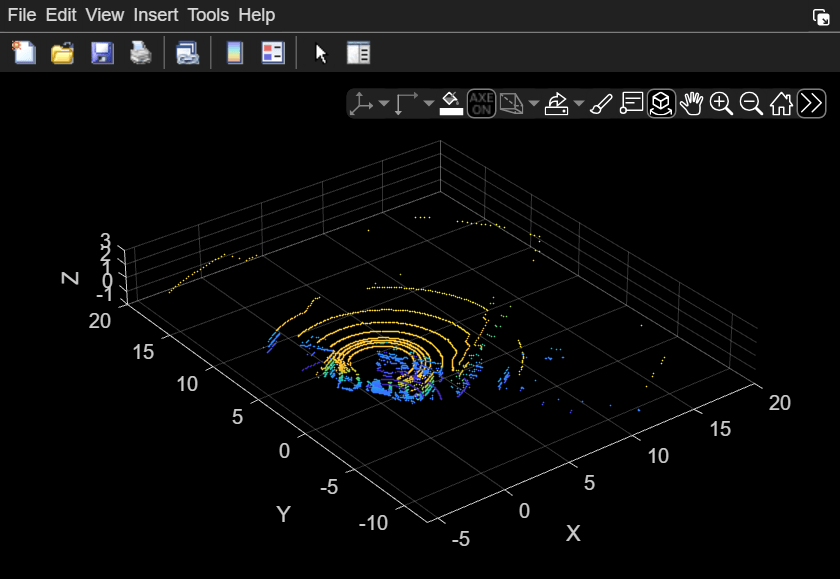 Preview the point cloud data using the preview object function of the sicklidar object. The preview window opens with the axes limits specified by the three vectors you pass to the preview function. Note that you must close the preview window before you can use the read object function.