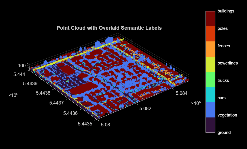 lasReader = lasFileReader(fullfile(trainDataFolder,"5080_54435.las")); [pc,attr] = readPointCloud(lasReader,"Attributes","Classification"); labels = attr.Classification; % Select only labeled data. pc = select(pc,labels~=0); labels = labels(labels~=0); classNames = ["ground"; ... "vegetation"; ... "cars"; ... "trucks"; ... "powerlines"; ... "fences"; ... "poles"; ... "buildings"]; figure ax = pcshow(pc.Location,labels); helperLabelColorbar(ax,classNames) title("Point Cloud with Overlaid Semantic Labels")