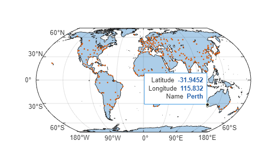 NumPointsproperty of each shape object is1. In this case, the data tips contain the latitude and longitude coordinates of the data points.