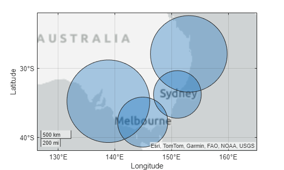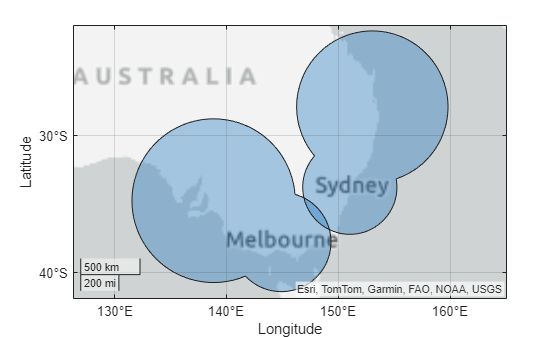 GT1 = geocode(["Adelaide","Brisbane"]); shape1 = buffer(GT1.Shape,6); GT2 = geocode(["Melbourne","Sydney"]); shape2 = buffer(GT2.Shape,3.5);