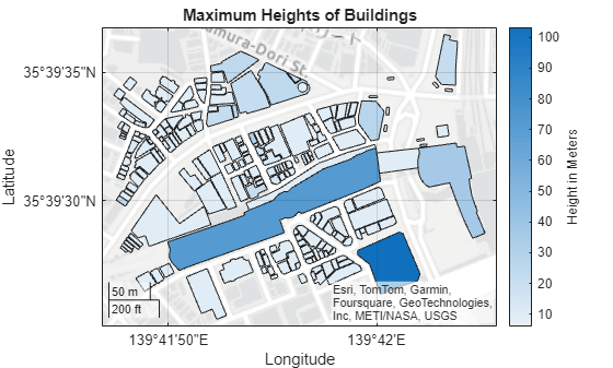 figure geoplot(buildingsLayer,ColorVariable="MaxHeight") title("Maximum Heights of Buildings") colormap sky c = colorbar; c.Label.String = "Height in Meters";