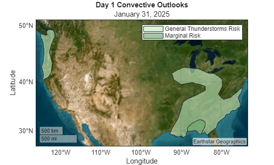 dt = datetime("today",Format="MMMM d, yyyy"); title("Day 1 Convective Outlooks",string(dt))