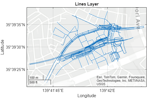 linesLayer = readgeotable(filename,Layer="lines");地図上にラインを表示します。