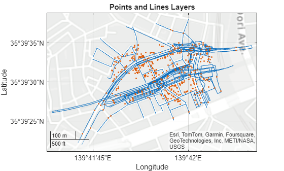 hold on geoplot(pointsLayer) title("Points and Lines Layers")