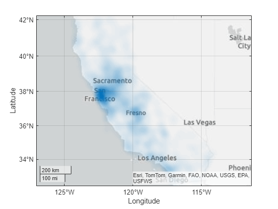 geodensityplot(___, は、1 つ以上の名前と値の引数を使用して、密度プロットのプロパティを指定します。プロパティの一覧については、DensityPlot Properties を参照してください。 Name=Value)