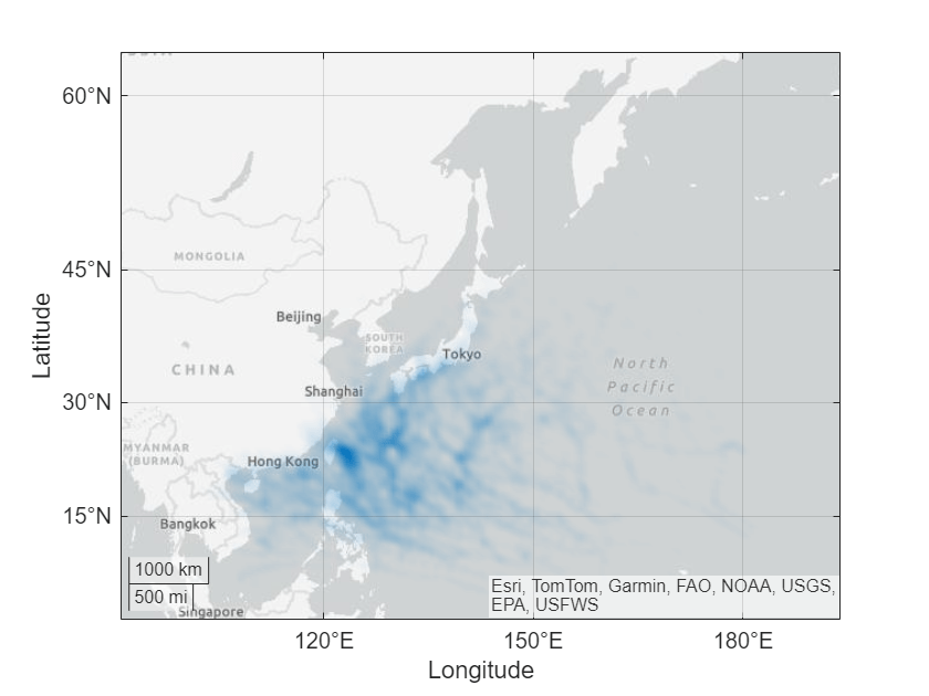 dp = geodensityplot(___) は、DensityPlot オブジェクトを返します。dp を使用して、プロットの作成後にプロパティを設定します。プロパティの完全な一覧については、DensityPlot Properties を参照してください。