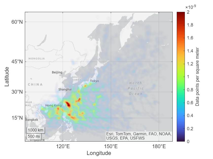 地理座標軸上でプロットする場合、関数 geodensityplot では、座標は WGS84 座標参照系を基準とすると仮定します。別の座標参照系を基準とする座標を使用してプロットすると、座標がずれて表示される可能性があります。