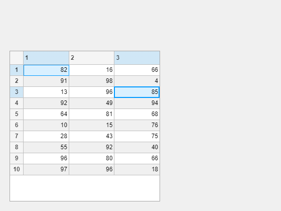 uit = uitable(fig,'Data',randi(100,10,3));対話型のテスト ケースを作成し、インデックス (1,1) および (3,3) をもつセルを選択します。