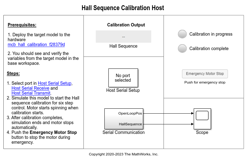 ホスト モデルはシリアル通信を使用してターゲット モデルに指令を送り、V/f 制御を使用して開ループ構成でモーターを駆動します。ホスト モデルでは、計算されたホール センサー シーケンスが表示されます。