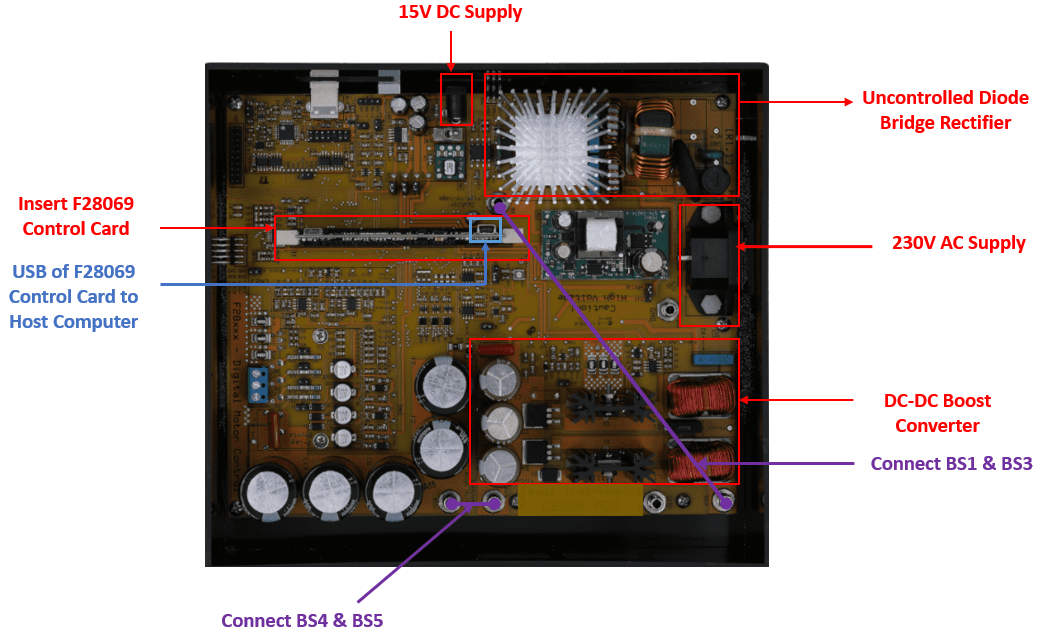 The AC-DC rectification stage uses a traditional uncontrolled H-bridge rectifier. The DC-DC boost converter on the kit has a two-phase interleaved topology. The duty cycle of the PWM output determines the amount of boost imparted to the input voltage.