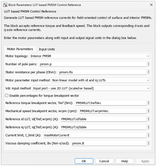 For either model, in the Motor Parameters tab of LUT based PMSM Control Reference block, verify that Motor parameter input method parameter is set to Non-linear model with id and iq LUTs and that the Reference id LUT, id(Tref,wrpm) (A) and Reference iq LUT, id(Tref,wrpm) (A) parameters are set to PMSMLUT.idTable and PMSMLUT.iqTable, respectively.