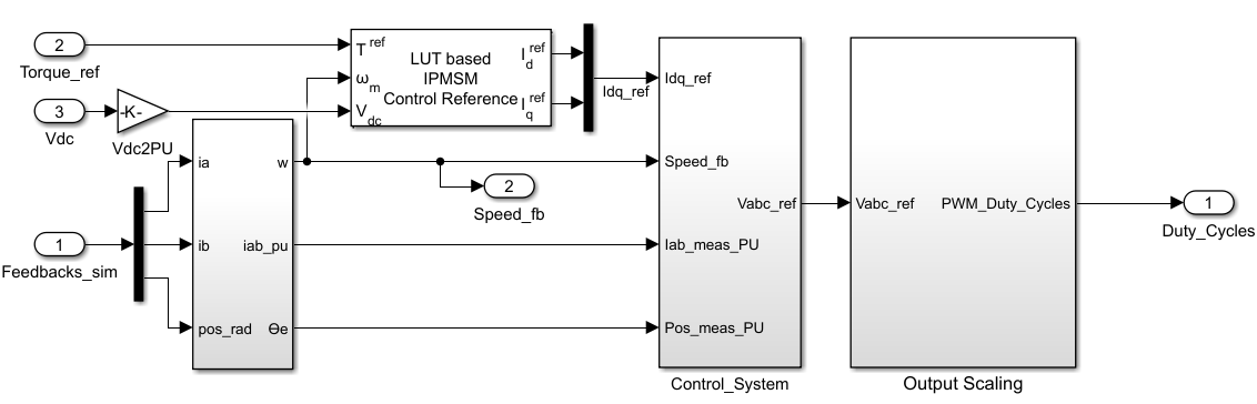 If you selected the model RunNonlinearPMSM.slx, the block outputs the d-axis and q-axis reference currents from the input motor speed, load torque, and battery voltage. The torque control system then compares the computed reference currents against measured currents to determine reference voltages and PWM duty cycles.
