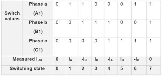 Similarly, other sectors have a different sequence of switching states. You can determine the motor phase currents from the measured IDC value using the following table.