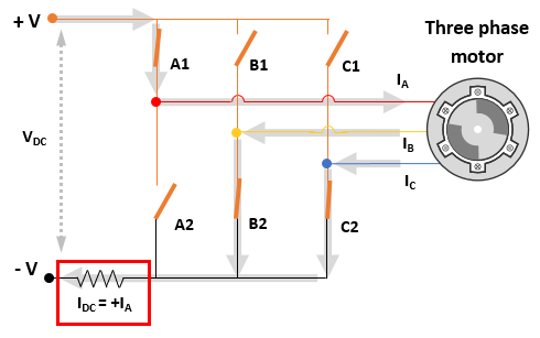 The DC bus or single shunt current measurement method only measures the current in the DC shunt. From the preceding figure, you can infer that the DC shunt current is equal to +Ia during this switching state. Similarly, for switching state 2, the switches operate as following: