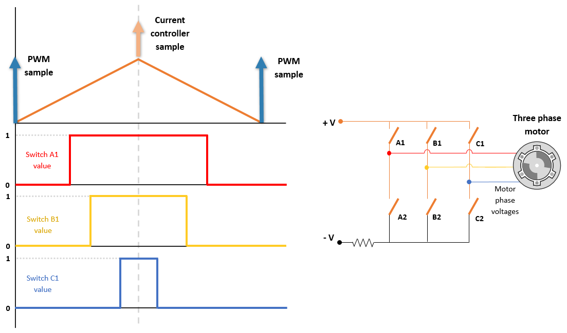 In any given sector, the controller approximates the target voltage vector by blending the two nearest active voltage vectors and one or more null vectors (where all phases are shorted). Because the DC shunt only sees current during active vectors, the sector information indicates which motor phases are currently connected to the DC bus.