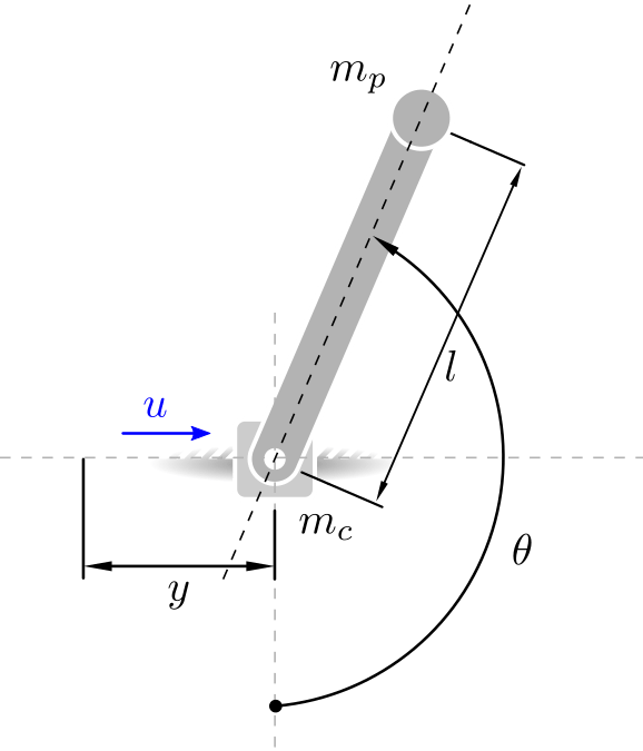 The cart-pole system consists of a cart that can move horizontally and a pendulum (that is, a pole) mounted on the cart, free to swing in the vertical plane. The control input is the horizontal force applied to the cart, . Since the pendulum is not directly actuated, the system is underactuated.