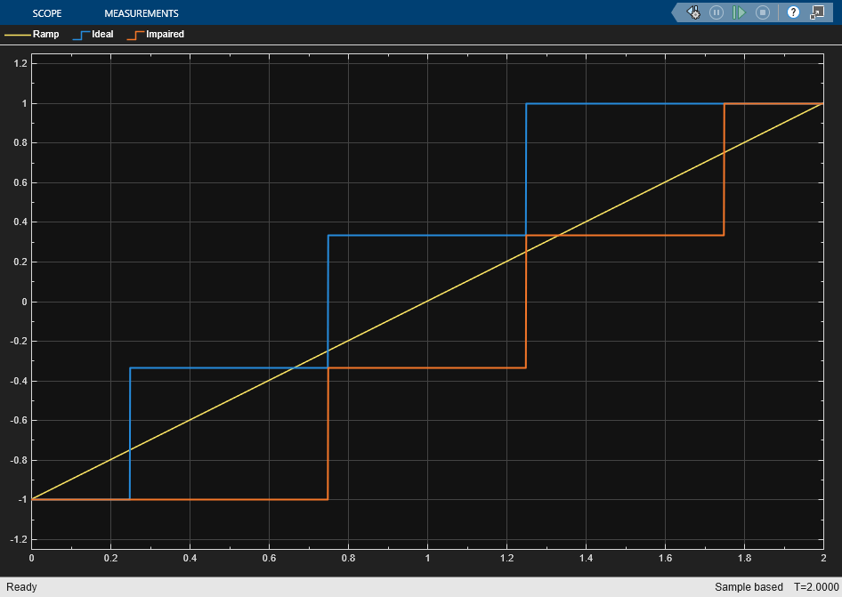 The model has two 4-bit Quantizer blocks connected to the same input signal. The quantizer blocks are identical in every way, but one is label Ideal and the other is labeled Impaired. Initially, none of them have any impairments.