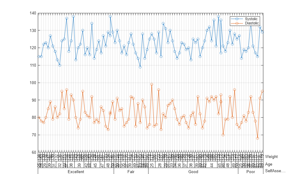 load patients T = table(Age,Height,Weight,Smoker,... Systolic,Diastolic,SelfAssessedHealthStatus)