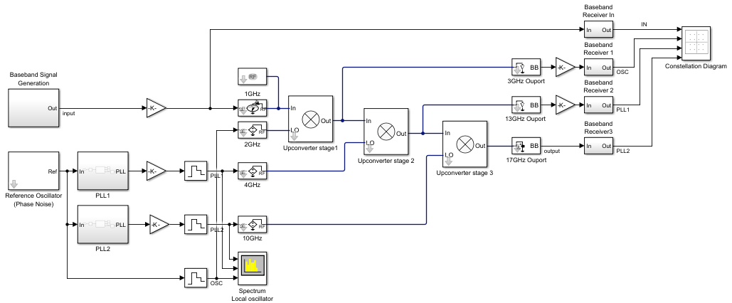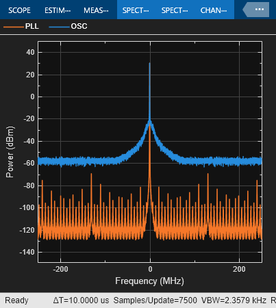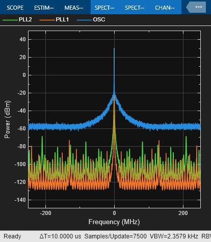 In the model above the 'Reference Oscillator' subsystem creates a signal with a given phase noise profile that is directly used as local oscillator (LO) in an RF upconverter mixer. The same reference signal is then used to drive a PLL with a relatively narrow loop bandwidth. For comparison, the output of the PLL is used to drive a second RF upconverter mixer (i.e. 'Upconverter stage PLL' in the image above). The filtering effects of the PLL on the reference oscillator phase noise are shown in the spectrum scope “Spectrum Local Oscillator”.