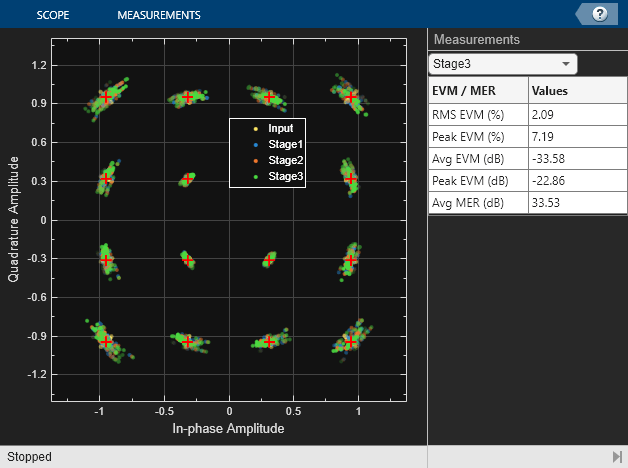 The RF input signal to both mixers is a modulated 16 QAM communications signal. A simple baseband receiver recovers the constellation of the input signal as well as the output of the two mixers. The constellation diagram allows to visualize and compare the three constellations and measure the Error Vector Magnitude (EVM).