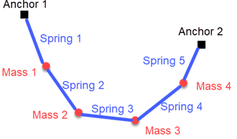 この図は、2 つの固定点からつるされている 5 つのバネと 4 つの質量を示しています。