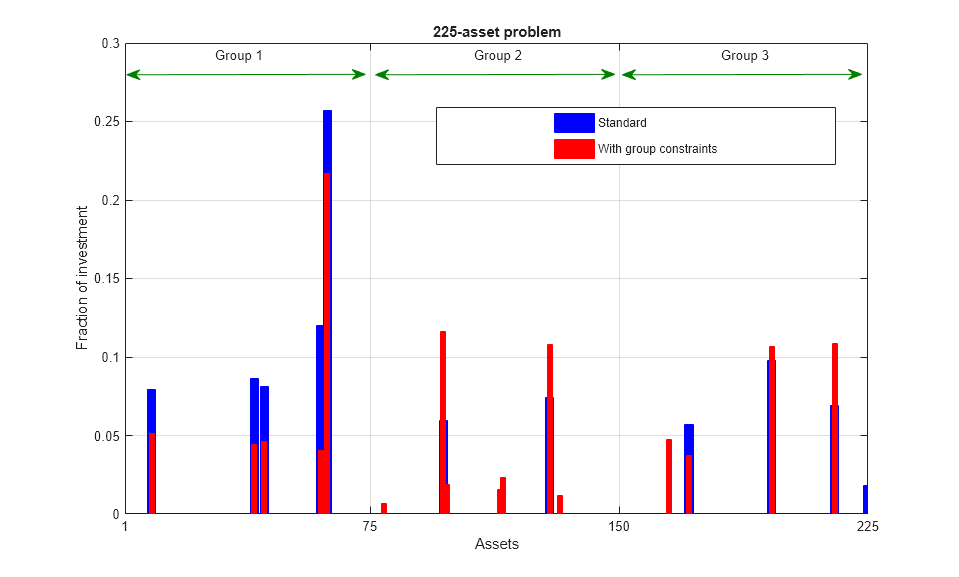 Groups = blkdiag(ones(1,nAssets/3),ones(1,nAssets/3),ones(1,nAssets/3)); Aineq = [Aineq; -Groups]; % convert to <= constraint bineq = [bineq; -0.3*ones(3,1)]; % by changing signs